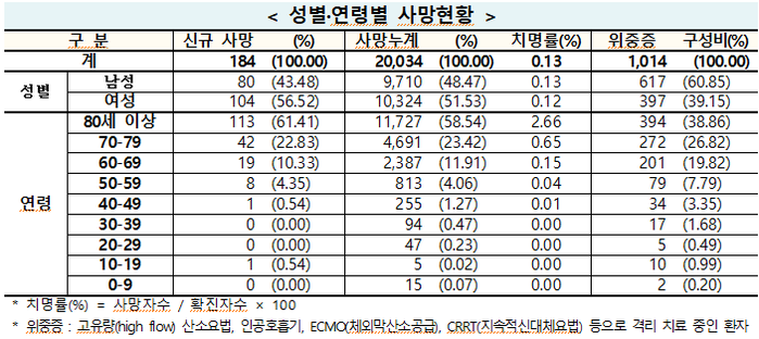 전날 사망자 184명 중에서도 60세 이상 고령층이 174명으로 94.6%를 차지했다. 이중 80세 이상이 113명, 70대가 42명, 60대가 19명이었다. 이외 50대에서 8명, 40대와 10대에서 각 1명씩의 사망자가 나왔다.