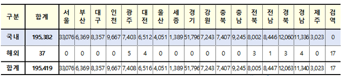 신규 확진자의 감염경로를 보면 지역발생(국내감염)이 19만5382명, 해외유입이 37명이다.