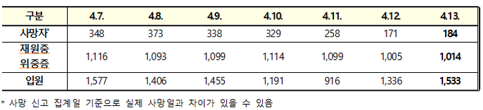 코로나19와 관련한 사망자는 184명으로, 직전일보다 13명이 많다. 그러나 이틀 연속 100명대를 유지했다.