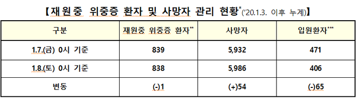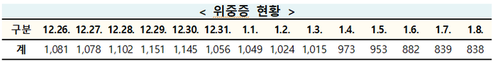 이날 위중증 환자는 838명을 전날보다 1명이 적다. 지난달 29일 1151명까지 치솟았던 위중증 환자는 이후에도 닷새 동안 1천명을 넘다가 지난 4일과 5일 900명대로 내려온 뒤 6일부터 사흘째(882명→839명→838명) 800명대를 보이고 있다.