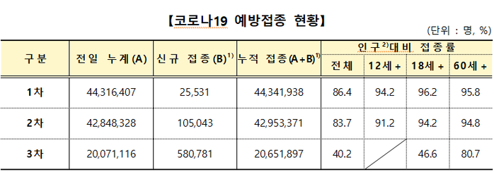 코로나19 전국민 백신 접종률은 1차 86.4%, 2차 83.7%, 3차 40.2%다.