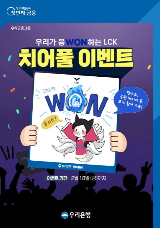 우리금융지주의 자회사 우리은행(은행장 권광석)은 2022년 LCK 스프링 시즌 개막에 맞춰‘SNS 치어풀 인증 이벤트’와‘우리WON뱅킹 퀴즈 이벤트’를 실시한다고 6일 밝혔다.