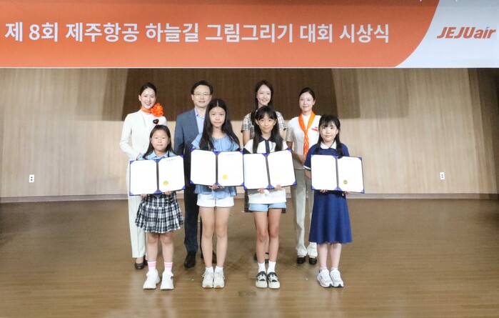 | ▲9월12일 서울 강서구 국립항공박물관 대강당에서 진행된 제주항공 제8회 ‘하늘길 그림 그리기 대회’시상식에서 수상자와 김이배 제주항공 대표이사(뒷줄 왼쪽 2번째), 객실승무원들이 함께 기념사진을 찍고 있다. |