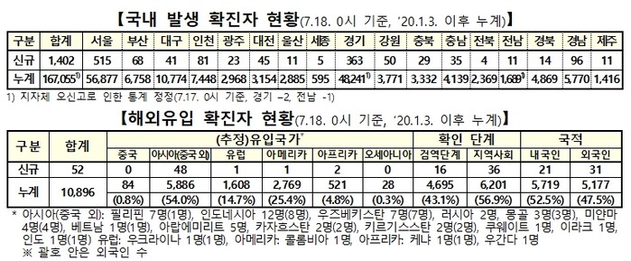 ▲ 18일 0시 기준 코로나19 국내발생 및 해외유입 확진자 현황. [출처=중앙방역대책본부] |