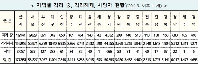 ▲ 18일 0시 기준 코로나19 지역별 격리 및 사망자 현황. [출처=중앙방역대책본부] |