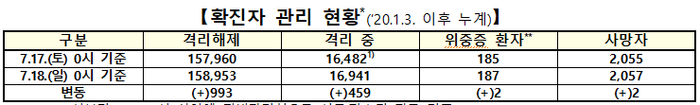 ▲ 18일 0시 기준 코로나19 확진자 관리 현황. [출처=중앙방역대책본부] |