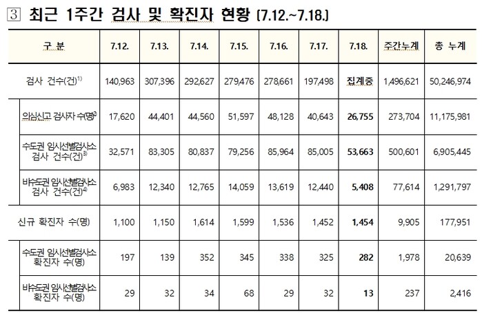 전날 전국 임시선별검사소 검사 건수는 총 5만9071건(수도권 5만3663건·비수도권 5408건)이며, 이곳에서 295명의 확진자가 새롭게 나왔다. 이날 전체 확진자 1454명의 20.3%를 차지한다.