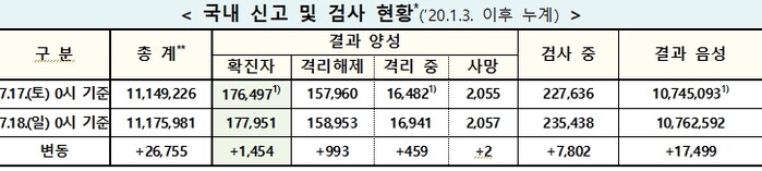 중앙방역대책본부는 18일 0시 기준으로 신규 확진자가 1454명 추가돼 누적 17만7951명(해외유입 1만896명)으로 집계됐다고 밝혔다.