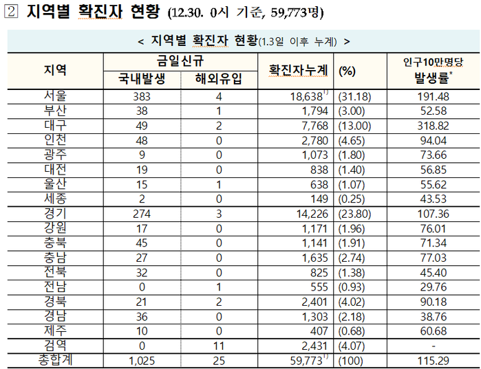 질병관리청 중앙방역대책본부(방대본)는 30일 0시 기준으로 전날 대비 코로나19 신규 확진자가 1025명이 추가돼 누적 확진자 수는 5만9773명(해외유입 5358명)으로 집계됐다고 밝혔다.