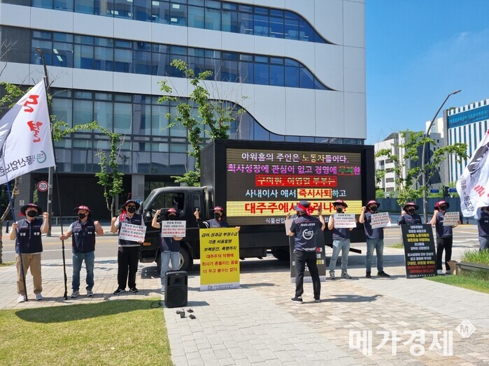 | ▲ <구미현·이영렬 사내이사의 사퇴를 촉구하는 노조.[사진=정호 기자]> |