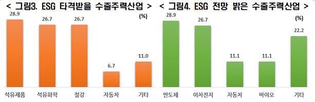 반면 ESG 확산으로 전망이 가장 밝은 산업에 대해서는 반도체(28.9%)를 가장 많이 꼽았고, 이어 이차전지(26.7%), 자동차(11.1%), 바이오(11.1%) 순으로 나타났다.
