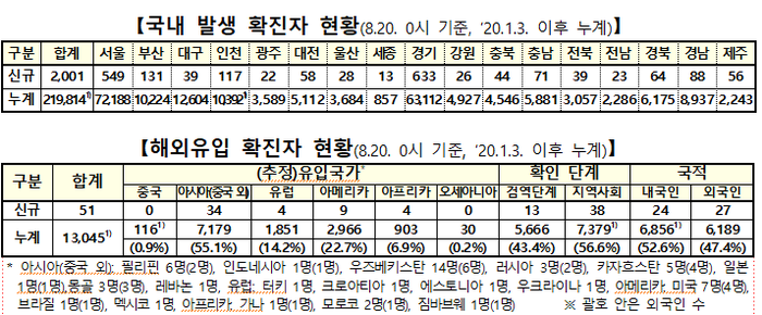 신규 확진자 2052명 중 전국 곳곳에서 확인된 국내발생(이하 지역발생) 확진자는 2001명이고 해외유입 확진자는 51명이다. 전날보다 지역발생은 113명이 줄었으나 해외유입은 13명이 늘었다. 전국 17개 광역지자체 시도에서 모두 지역발생 확진자가 나왔다.