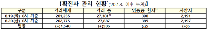 ▲ 20일 0시 기준 코로나19 확진자 관리 현황. [출처=중앙방역대책본부] |