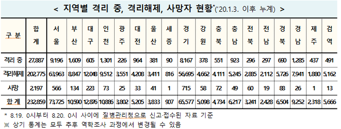 ▲ 20일 0시 기준 코로나19 지역별 격리 및 사망자 현황. [출처=중앙방역대책본부] |