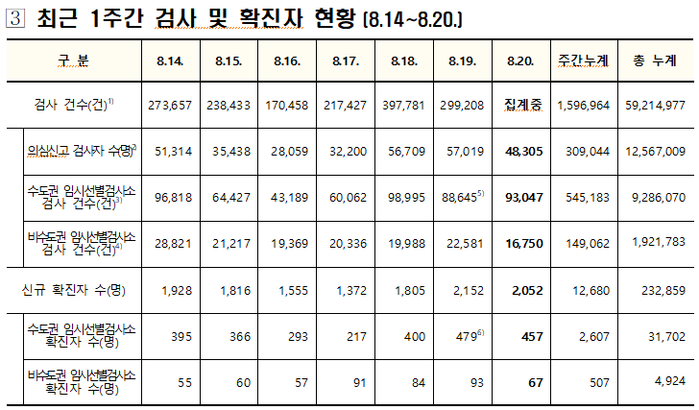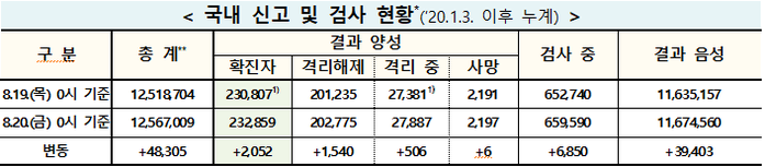 중앙방역대책본부는 20일 0시 기준으로 코로나19 신규 확진자가 2052명 확인되어 누적 확진자 수는 23만2859명(해외유입 1만3045명)으로 집계됐다고 밝혔다.