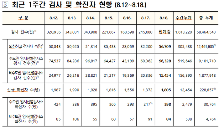 이와는 별도로 전날 하루 전국 임시선별검사소 검사 건수는 총 11만1782건(수도권 9만6328건·비수도권 1만5454건)으로 전날 총 8만398명(수도권 6만62명·비수도권 2만336명)보다 3만1384명이 많다.