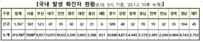 ▲ 18일 0시 기준 코로나19 국내발생(지역발생) 확진자 현황. [출처=중앙방역대책본부] |
