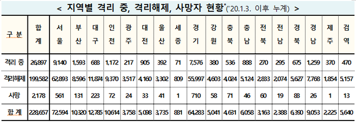 ▲ 18일 0시 기준 코로나19 지역별 격리 및 사망자 현황. [출처=중앙방역대책본부] |