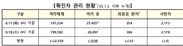 ▲ 18일 0시 기준 코로나19 확진자 관리 현황. [출처=중앙방역대책본부] |