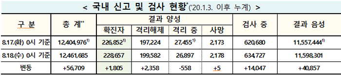 ▲ 18일 0시 기준 코로나19 국내 신고 및 검사 현황. [출처=중앙방역대책본부] |