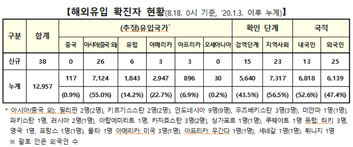 해외유입 확진자 38명 중 15명은 입국 검역단계에서 확인됐고, 23명(경기 6명, 서울 3명, 대전·전남·경북 각 2명, 부산·인천·광주·울산·충북·전북·경남·제주 각 1명)은 지역사회에서 자가격리중 확진됐다. 국적별로는 내국인 13명, 외국인 25명이다.
