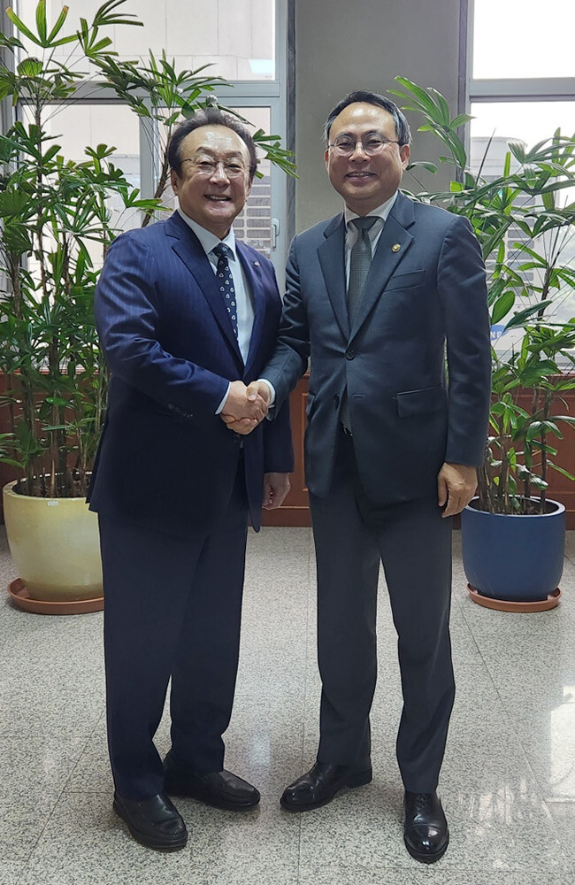 ▲김인 새마을금고중앙회 회장 직무대행(왼쪽)과 고기동 행정안전부 차관(오른쪽)이 새마을금고 혁신방안 등과 관련한 면담에 앞서 악수를 나누고 있다. [사진=새마을금고중앙회] |