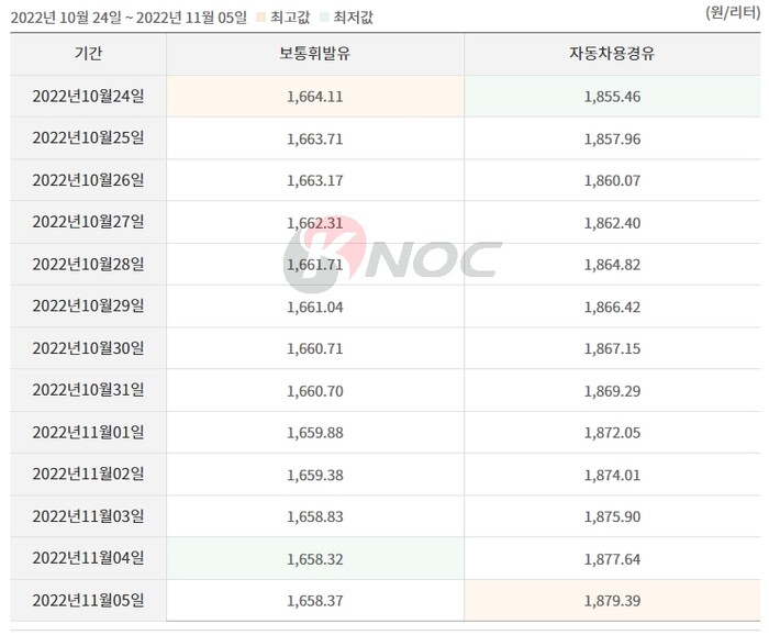 ▲ 최근 일간 전국 주유소 휘발유와 경유 리터당 판매가격. [한국석유공사 유가정보 서비스 오피넷 제공]