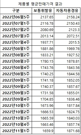 ▲ 제품별 전국 주유소 평균 판매가격. [한국석유공사 유가정보서비스 오피넷 제공]