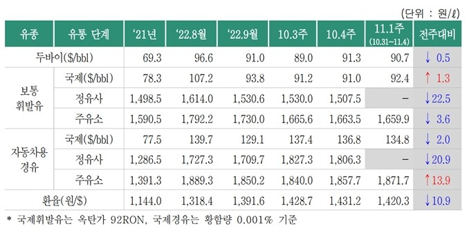 다만 국제 휘발유 평균 가격은 지난주보다 1.3달러 오른 배럴당 92.4달러, 국제 자동차용 경유 가격은 2.0달러 내린 배럴당 134.8달러를 각각 기록했다.