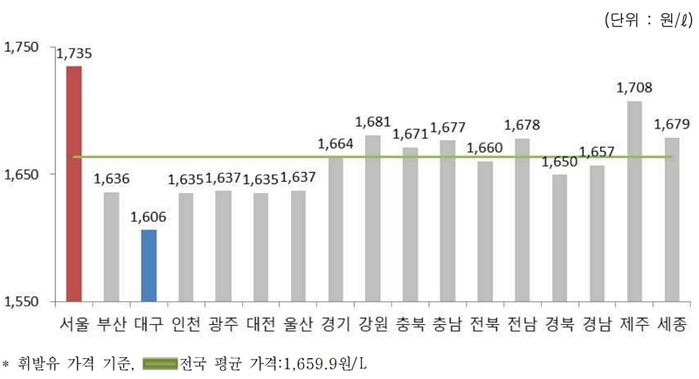 국내 최고가 지역인 서울의 이번 주 휘발유 평균 판매가격은 지난주보다 4.9원 하락한 1729.9원이었으며 최저가 지역인 대구는 1.0원 내린 1605.0원이었다.
