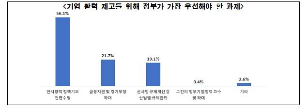 기업 활력 제고를 위해 정부가 가장 우선해야 할 정책과제로는 '반시장적 정책 기조 전면 수정'(56.1%)이라는 답이 가장 많았다. '금융지원 및 경기부양 확대'(21.7%), '신사업 규제 개선 등 산업별 규제 완화'(19.1%) 등도 뒤를 이었다.