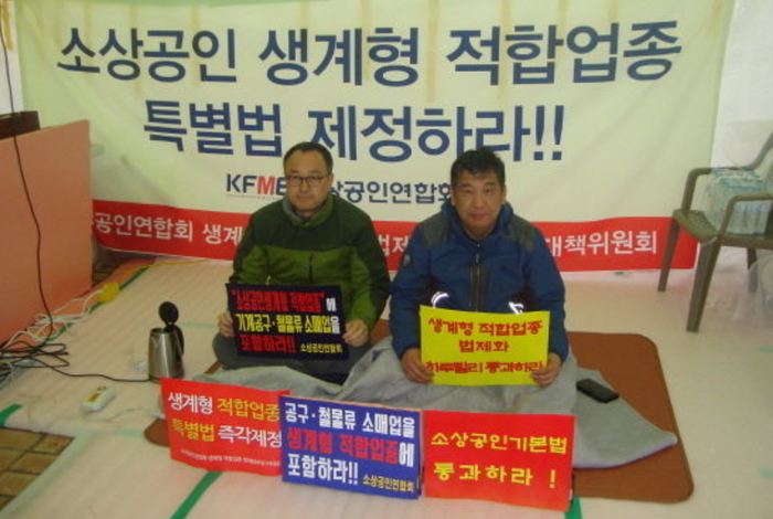 ▲ 소상공인 특별법안 마련 촉구를 위해 노숙투쟁하던 당시의 최승재 움부즈만 모습 [사진=이동훈 기자] |
