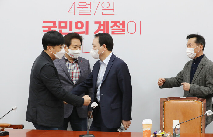 ▲ 국민의당 이태규 사무총장(왼쪽)이 21일 오전 서울 여의도 국회에서 열린 오세훈-안철수 서울시장 후보 단일화 양당 실무협상단 회의에서 국민의힘 정양석 사무총장(왼쪽 두 번째), 성일종 의원 등과 차례로 인사하고 있다. [서울= 연합뉴스] |