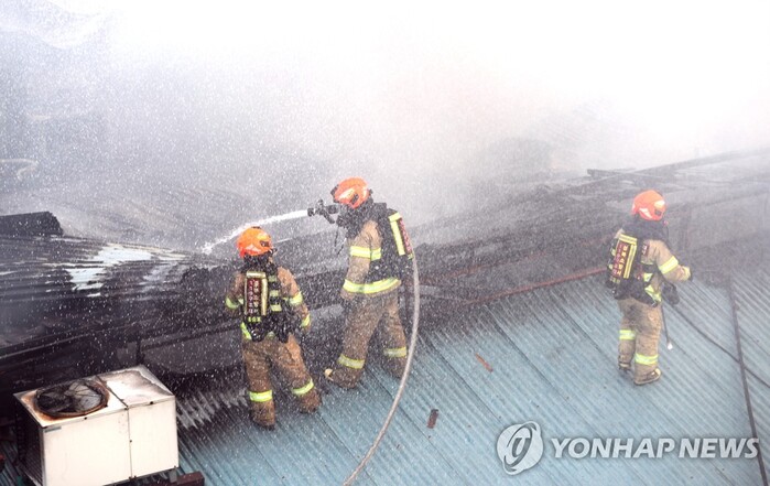 ▲ 21일 서울 청량리 청과물시장에서 화재가 발생해 소방관들이 진화작업을 하고 있다.[사진= 연합뉴스] |