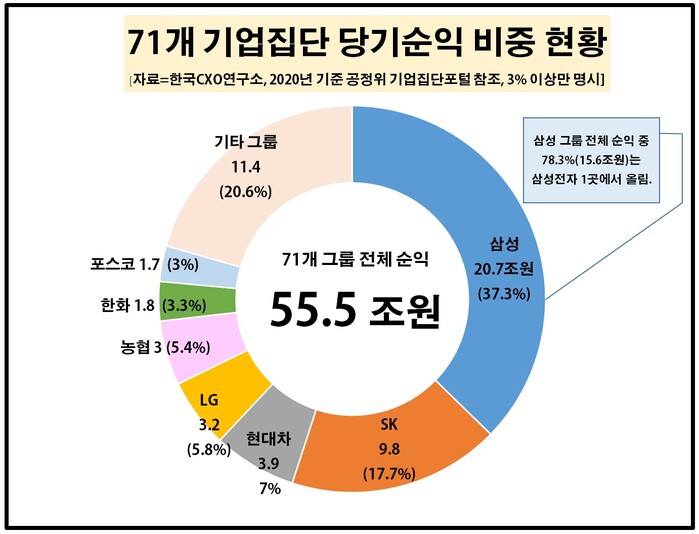 당기순이익은 삼성그룹이 20조 7000억 원 규모를 기록해 조사 대상 중 37%에 달하는 비중을 차지했다. 이 중 75%는 삼성전자가 벌어왔다.