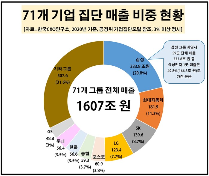한편, 지난해 국내 71개 그룹(소속회사 2612곳)의 매출 규모는 1607조 원으로 우리나라 명목 국내총생산(GDP)의 84% 수준인 것으로 조사됐다.