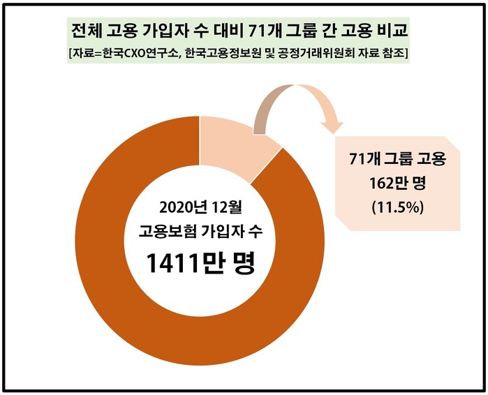 기업분석 전문 한국CXO연구소(소장 오일선)는 공정거래위원회가 올해 자산 5조 원 이상으로 지정한 71개 그룹을 대상으로 조사한 결과, 전체 직원 수는 162만 1958명으로 고용보험 가입 기준 근로자 수 1411만 명 중 11.5% 수준으로 집계됐다.