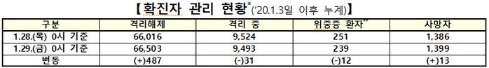 ▲ 29일 0시 기준 코로나19 확진자 관리 현황. [출처= 중앙방역대책본부] |