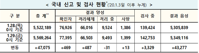 중앙방역대책본부(방대본)는 29일 0시 기준 전날 대비 코로나19 신규 확진자가 469명 발생해 지금까지 누적 확진자 7만7395명(해외유입 6245명)으로 집계됐다고 밝혔다.