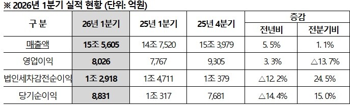 회사는 1분기 매출 15조 5605억원, 영업이익 8026억원, 순이익 8831억원을 기록했다고 24일 밝혔다. 지난해 같은 기간보다 매출은 5.5%, 영업이익은 3.3% 증가했다.