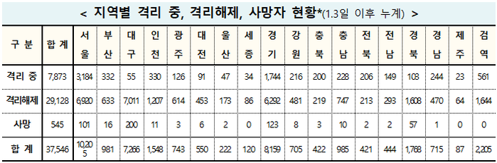 ▲ 6일 0시 기준 코로나19 지역별 격리 및 사망자 현황. [출처= 중앙방역대책본부] |