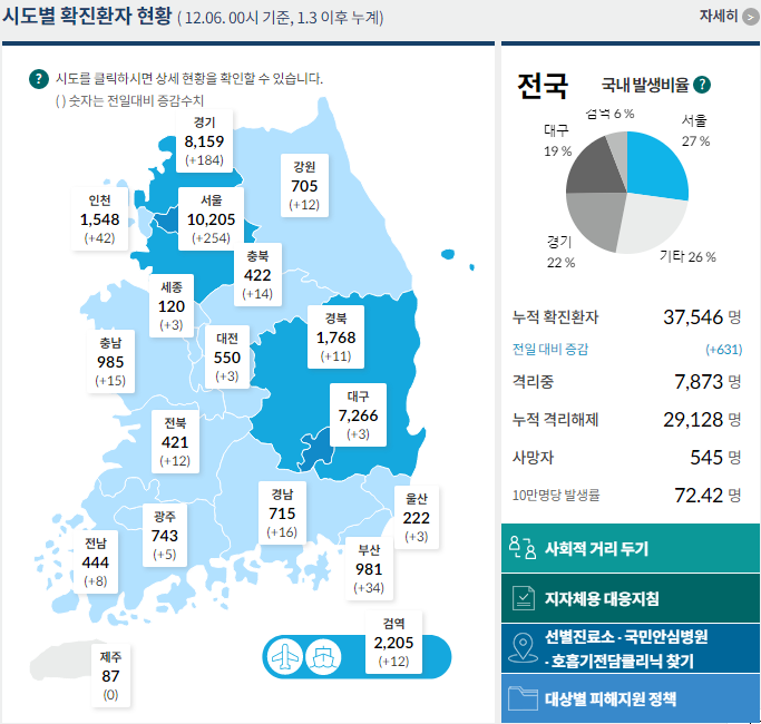 ▲ 6일 0시 기준 코로나19 시도별 확진환자 현황. [출처= 중앙방역대책본부] |