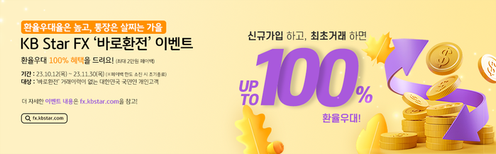 [메가경제=송현섭 기자] KB국민은행은 오는 11월30일까지 ‘KB Star FX’의 ‘바로환전’ 거래를 처음으로 이용하는 고객에게 100% 환율 우대혜택을 제공한다고 30일 밝혔다.