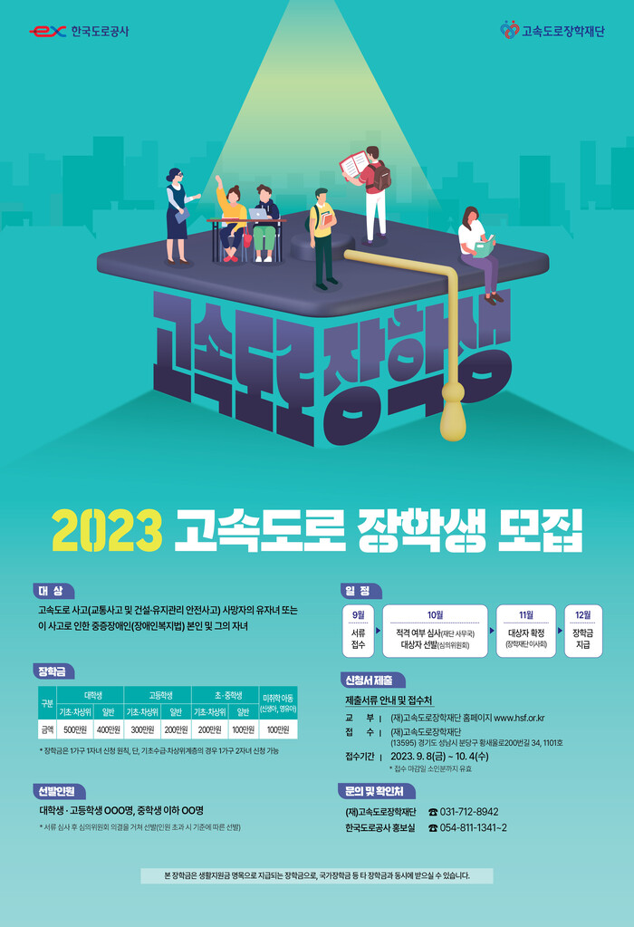 [메가경제=장준형 기자] 한국도로공사(사장 함진규)와 고속도로장학재단(이사장 손진식)은 고속도로 사고 피해자 가족을 대상으로 9월 8일(금)부터 10월 4일(수)까지 2023년 고속도로 장학생을 모집한다고 7일 밝혔다.