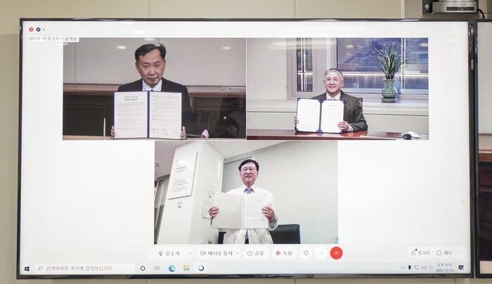▲ 지난 15일 업무협약식은 비대면 화상회의로 진행됐다. (상단 왼쪽부터 시계방향으로) 신동렬 성균관대총장, 함영준 오뚜기 회장, 권오정 삼성서울병원장. [사진=오뚜기 제공] |