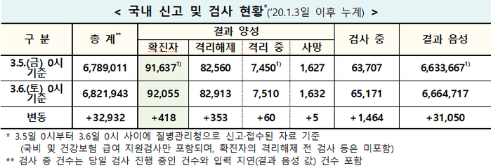 ▲ 6일 0시 기준 코로나19 국내 신고 및 검사 현황. [출처= 중앙방역대책본부] |
