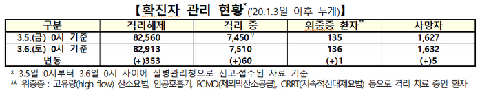 ▲ 6일 0시 기준 코로나19 확진자 관리 현황. [출처= 중앙방역대책본부] |