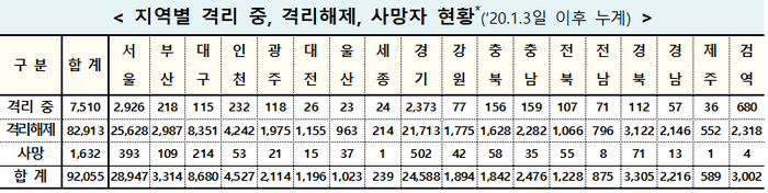 전날 대비 353명이 추가 완치돼 누적 격리해제자는 8만2913명으로 완치율은 90.07%를 보였다. 격리치료 중인 환자는 60명 늘어 총 7510명이다.