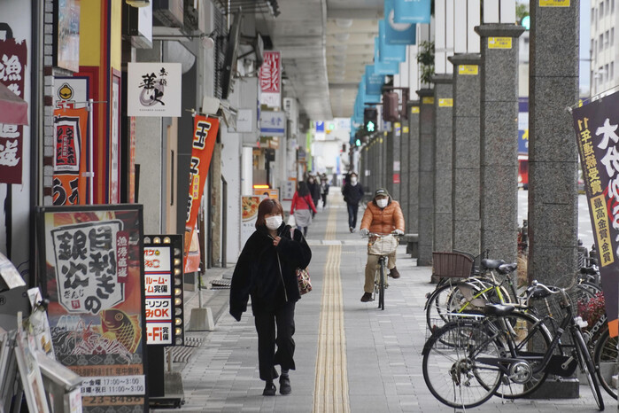 ▲ 지난 7일 일본 야마구치현 이와쿠니의 거리에서 행인들이 마스크를 쓰고 오가고 있다. 일본 정부는 코로나19 확산의 기세가 심한 오키나와, 야마구치, 히로시마 등 3개 현에 긴급사태 전 단계의 방역 대책인 중점조치를 9일부터 적용하기로 이날 결정했다. [이와쿠니 AP/교도=연합뉴스]