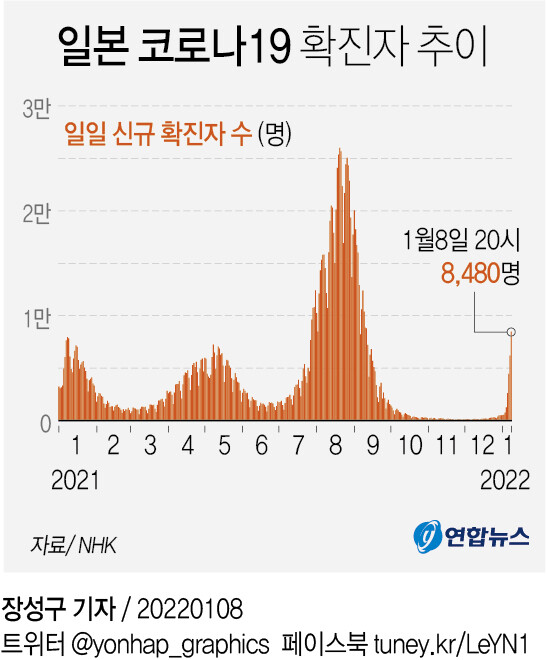 일본 NHK 홈페이지에 따르면, 8일 오후 8시 현재 일본 내 코로나19 신규 확진자 수는 8480명이라고 전했다. 일일 확진자 수가 8천 명을 넘은 것은 지난해 9월 11일 이래 119일만이다. 1주일 전인 1일(534명)에 비해 16배 가까이 급증했다.
